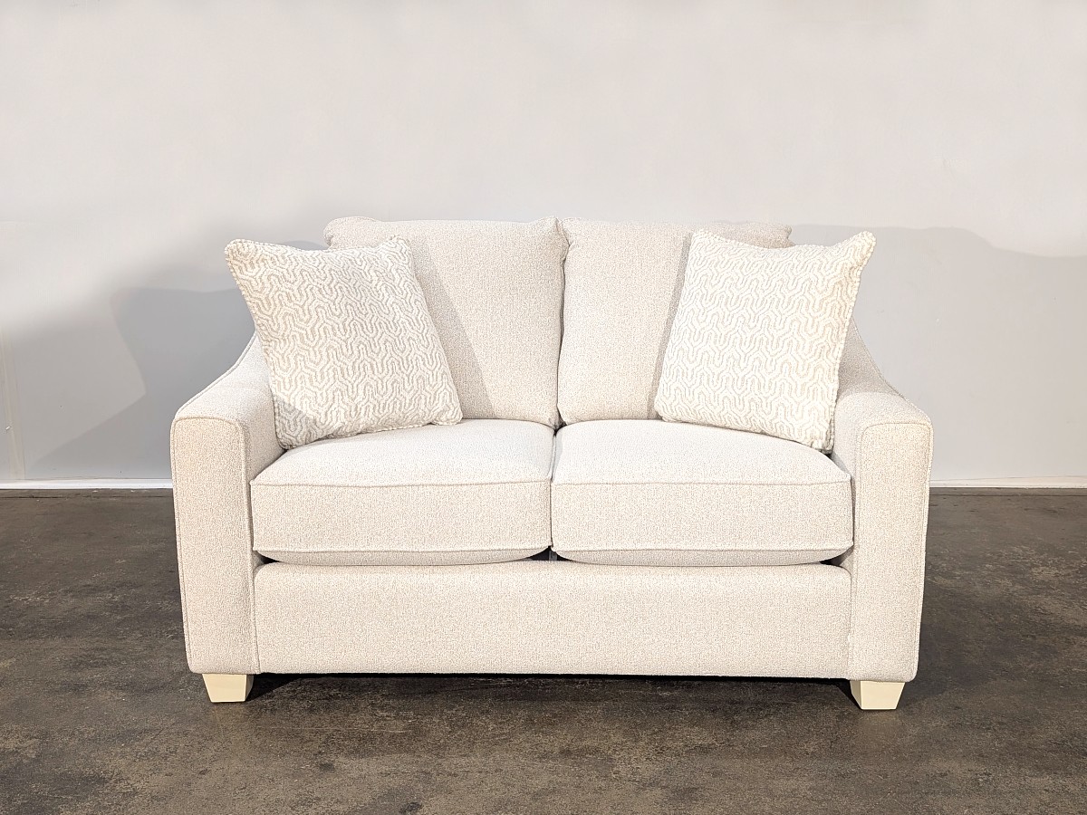 A modern sofa with sloped arm, semi attach back with box seat. The two over two back and seat cushions provide added comfort and a modern aesthetic.