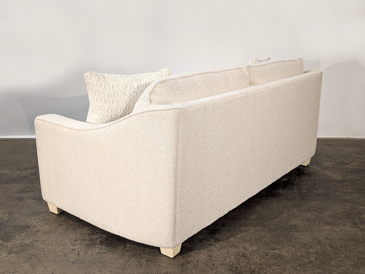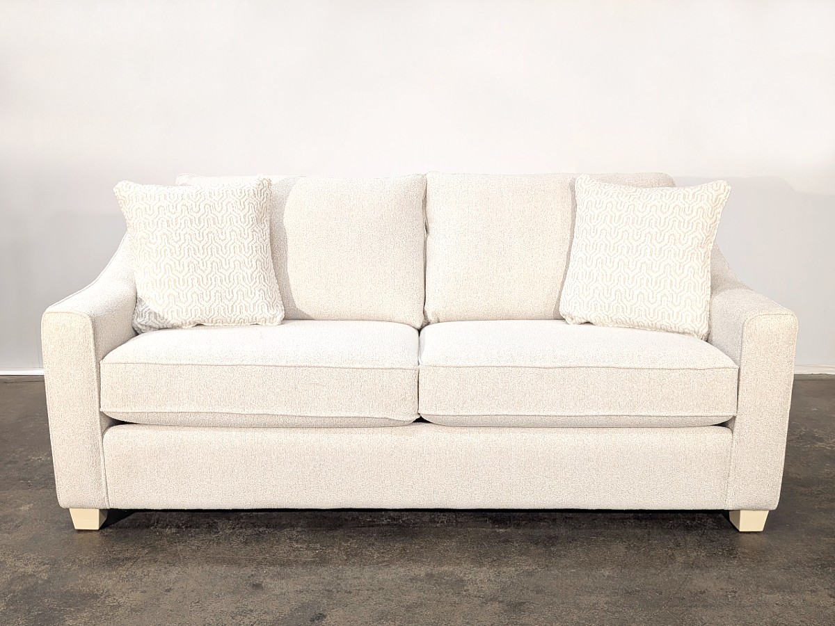A modern sofa with sloped arm, semi attach back with box seat. The two over two back and seat cushions provide added comfort and a modern aesthetic.