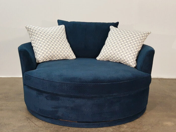 Round out your living room with the contemporary curves of this chair lounger. This inviting swivel chair beckons you to kick off your shoes and snuggle up. A tight barrel back completes the circle with a loose back pillow and several oversized throw pillows.